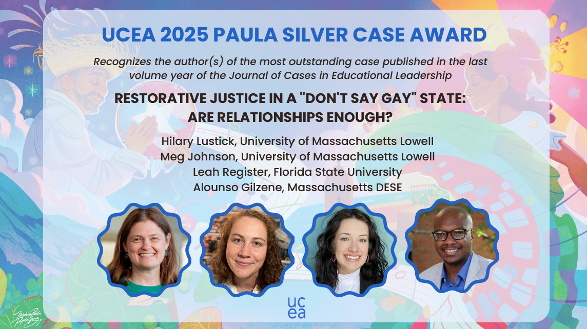 The Paula Silver Case Award was instituted by UCEA in 1999 to memorialize the life and work of Paula Silver, a UCEA associate director and president-elect who made significant contributions to our program through excellence in scholarship, advocacy of women, and an inspired understanding of praxis. A sterling silver bowl is presented annually to the author(s) of the most outstanding case published during the last volume of the UCEA Journal of Cases in Educational Leadership.